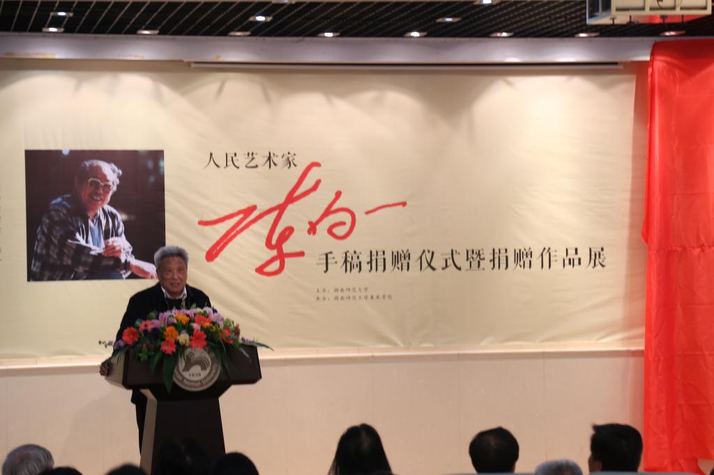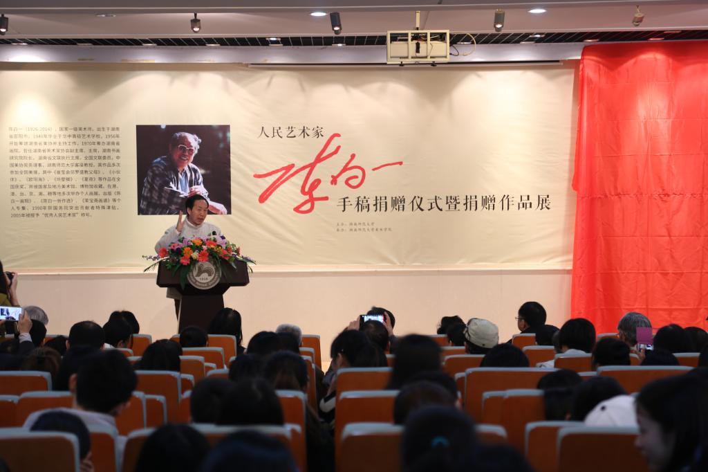 3月25日上午,“人民艺术家”陈白一手稿捐赠仪式暨捐赠作品展开幕式在我校威尼斯144777欢迎您隆重举行。陈白一先生的长子陈明大先生,省文联党组书记江学恭,湖南广播电视总台台长吕焕斌,省文联党组副书记夏义生,我校党委书记李民,副校长周俊武,原副校级督导、党委组织部长徐书华,省文联副主席、省美协主席、威尼斯官网教授朱训德,院党委书记谭伟,院党委副书记余英,副院长李少波、陈晓华,省博物馆馆长段小明,省文联副主席、省雕塑院院长雷宜锌,省美协副主席旷小津,省美协副主席、省书画研究院副院长石纲,省书画研究院展览部主任李亚辉,中国民间艺术专家、湖南美术出版社编审左汉中,湖南美术出版社美仑美术馆馆长陈荣义,省文史馆业务处处长曾今军,省花鸟协会主席柯桐之,长沙市文联党组书记王俏,长沙市文联主席何立伟等出席。捐赠仪式由周俊武主持。