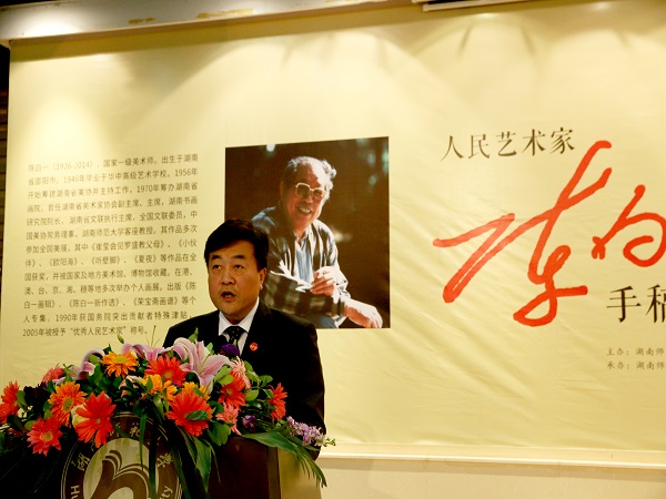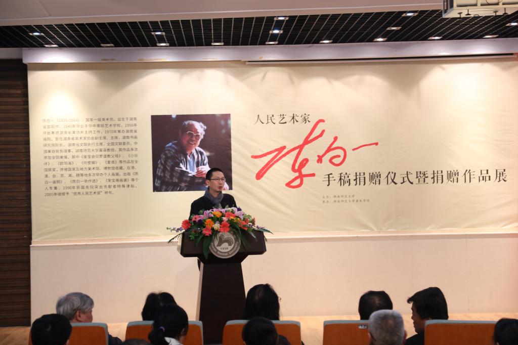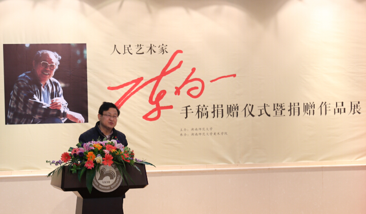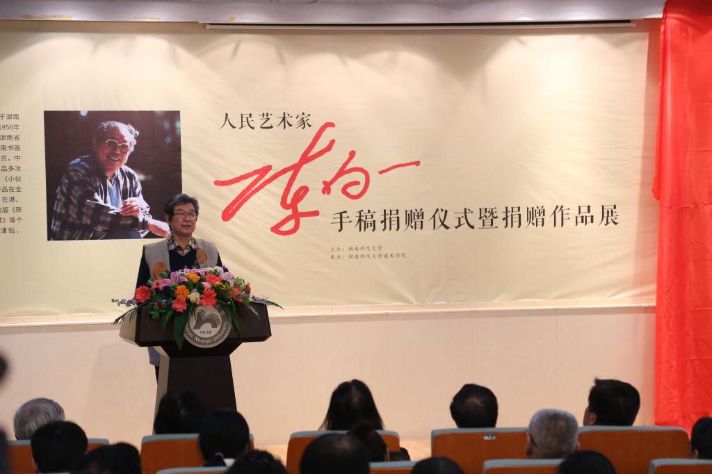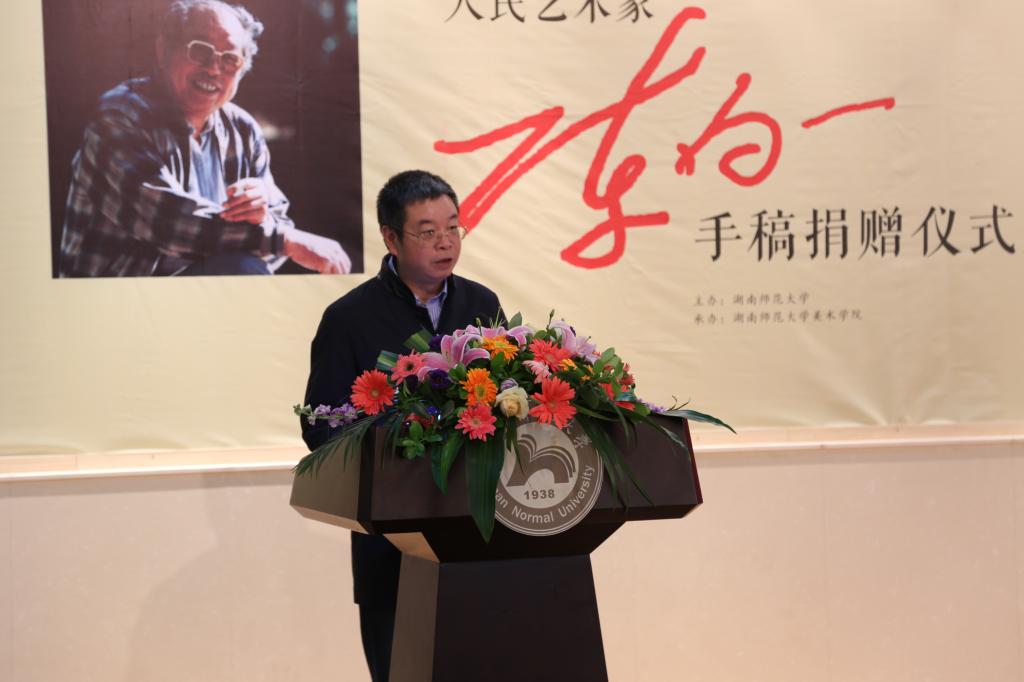 李民代表学校对陈明大先生及其家人的慷慨捐赠表示衷心的感谢,对莅临仪式的领导和嘉宾表示热烈的欢迎。他说,陈白一先生是享誉全国的著名艺术家,他为湖南美术事业的可持续发展作出了卓越的贡献。陈老先生以磊落雄健的艺术人生诠释了开拓创新、敢为人先的湖湘精神,更以其独具风骨的艺术形式传承了刚健自强、生生不息的中华文化。李民指出,陈白一先生的家人将家藏的300余件手稿作品无偿捐赠给学校,让我们更深刻认地识到陈先生及其家人的无私与博大。他代表学校向陈老先生致以崇高的敬意和深切的怀念,并再次向陈老先生的家人表示感谢。李民希望学校有关部门和威尼斯官网妥善收藏和保管好白一先生遗作,并做好相关研究工作,也希望同学们能够认真学习、深刻领悟,使陈白一先生的艺术语言与艺术精神代代相传,发扬光大。